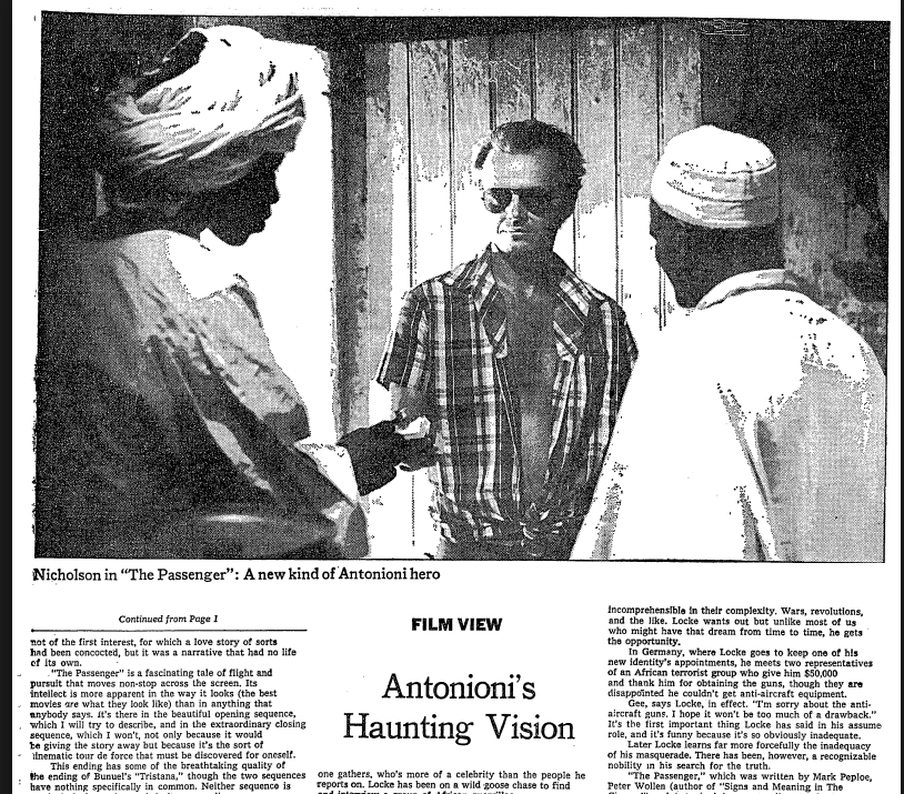 Canby’s “Film View,” review was published April 20th, 1975, and was titled, “Antonioni’s Haunting Vision”.